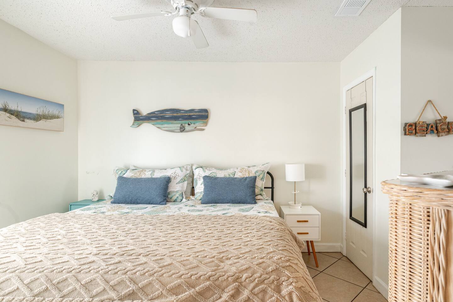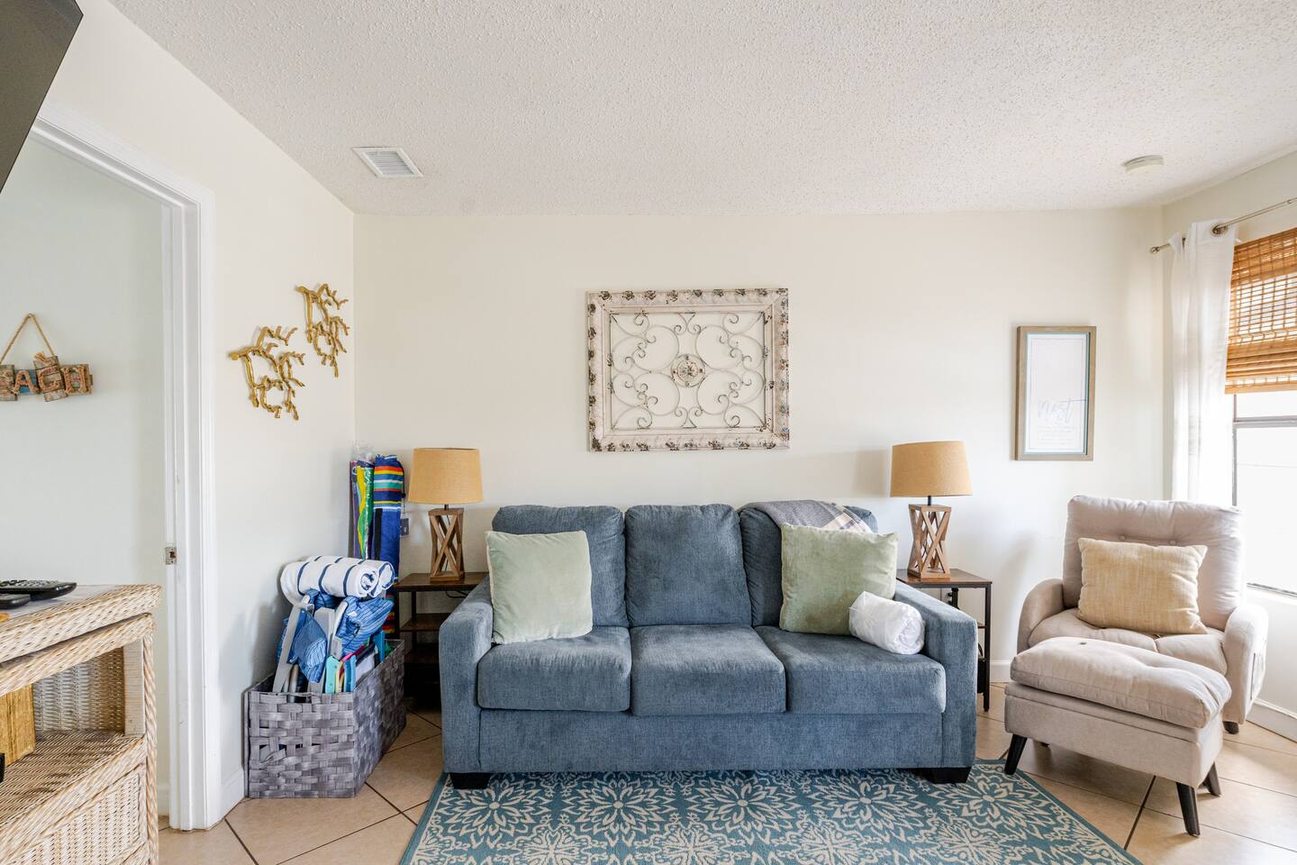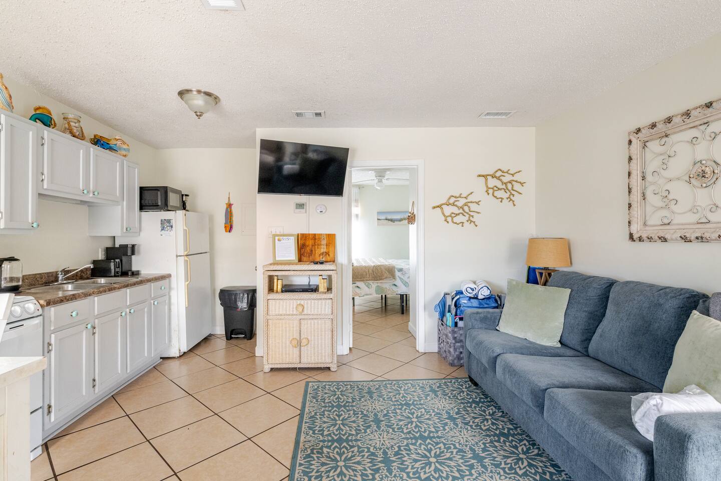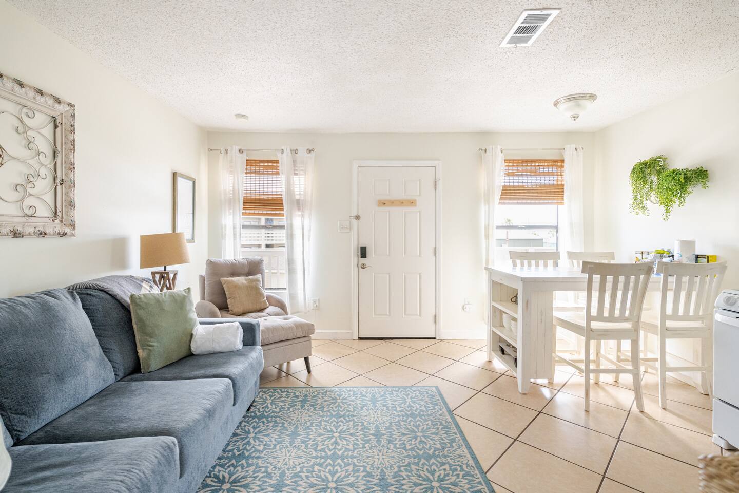You’ll fall in love with this cute and cozy 1 bedroom condo from the moment you walk in. With comfortable furnishings and seaside-themed décor, it’s the perfect haven for coming back to after a day soaking in the sun at the beach. Lots of natural light and a calming color palette of decor gives this condo a lovely beachy atmosphere! When it’s time to head down to the beach, it’s only 300 feet away! The comfortable open-plan living space features a sitting area with a pullout sofa (perfect for families with kids), an armchair, ottoman, and a 40” Roku tv. The kitchen is equipped with everything you need to prepare a delicious meal, including a fridge, stove, oven, microwave, dinnerware, and cookware. Dining table for 4. The cozy bedroom features a new king bed, 32" Roku tv, closet space and dresser. The modern bathroom has a bathtub/shower combo. On the property, you’ll have a sparkling pool to swim in. You’ll also have 1 covered parking spot, saving you money on the parking costs at the beach. You are welcome to bring 1 small dog with you (under 25 lbs.) for a non-refundable fee of $40. Pets must be crated when you leave them alone in the property. Dogs ARE NOT allowed on the public beach but keep reading for lots of places nearby where you CAN take your dog on adventures. ** Unit is located on the 2nd level and there are stairs. There are no elevators so if you require it, this unit is not for you. *** MUST BE a minimum of 25 years of age to book.